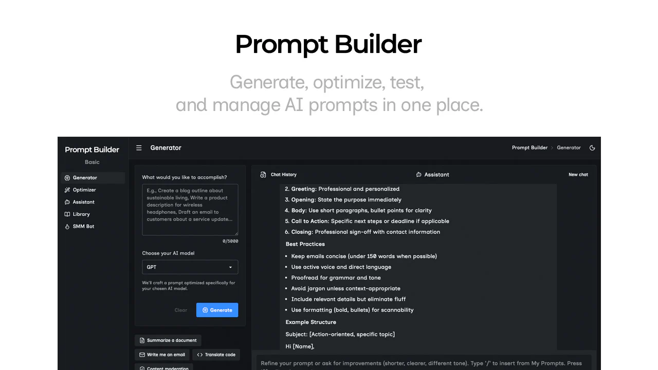 Oireann PromptBuilder struchtúr comhoibrithe do gach formáid agus iompar is fearr le samhlacha.
