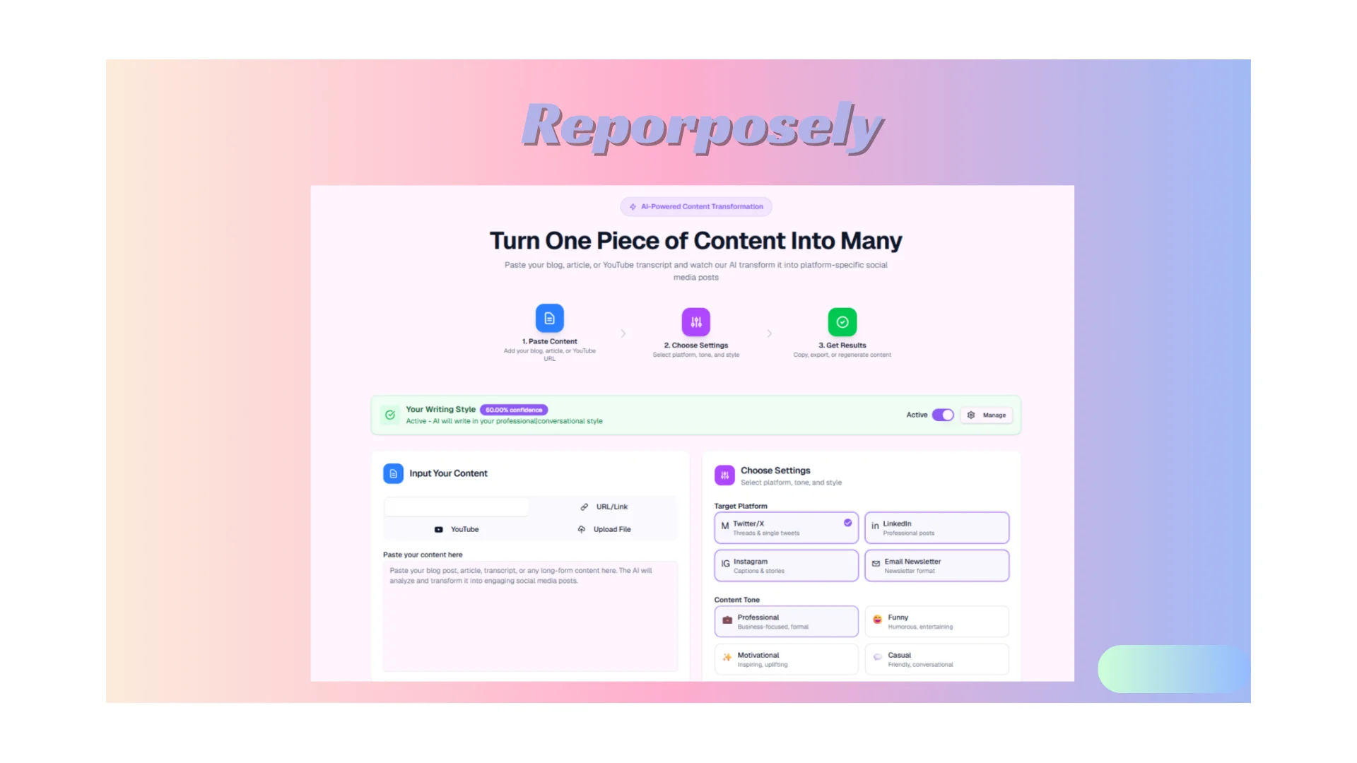 Reporposely is built for creators and teams that want to stay active across multiple platforms without spending hours creating new content.